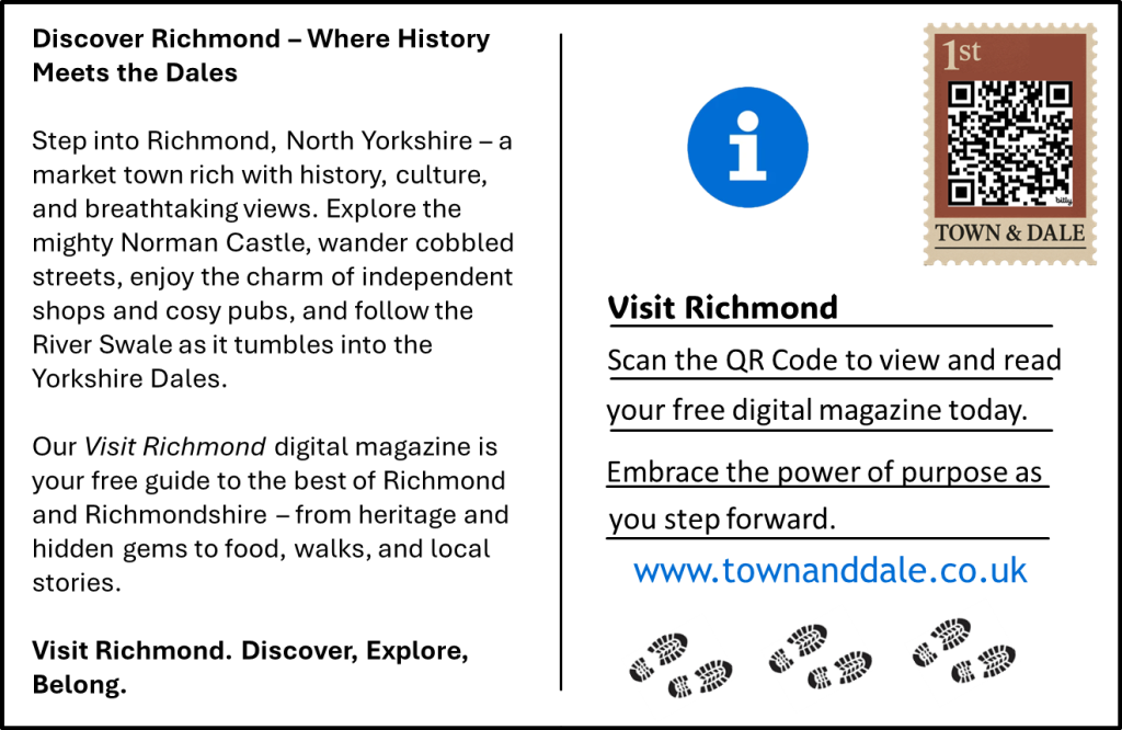 Each postcard features a striking, stamp-style QR code that links directly to both the Visit Richmond and Town & Dale digital magazines, offering tourists, visitors, and local residents a lasting souvenir of their time here — and a gateway to more stories, more places, and more ways to connect.